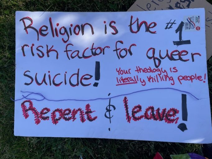 We stand in public affirmation of what we believe, especially in light of theology that has proven so damaging to people wrestling with their God-given sexual identity or gender that the only way they can see to end their pain is suicide. One Methodist minister protesting Mayday USA had a sign that read, “Religion is the #1 risk factor for queer suicide! Your theology is literally killing people! Repent and leave!”