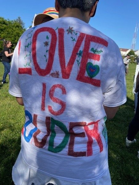 So on Saturday, May 24, Patsy, Consi, and I met here at the church to go over to Cal Anderson Park together. Patsy had her sunhat with a bright rainbow ribbon. Consi had painted “Love Is Louder” all over the back of a white tee shirt. And I wore the rainbow stole that Suzanne Fry made for me years ago and that is perfect for these situations. Before we left Prospect, we stood in the outer office, held hands, and prayed—for the Mayday USA folks, for the police, and for all of us showing up to stand in our own truth. We knew that the police had already made some arrests of protesters. We went anyway, with our message of love and peace.