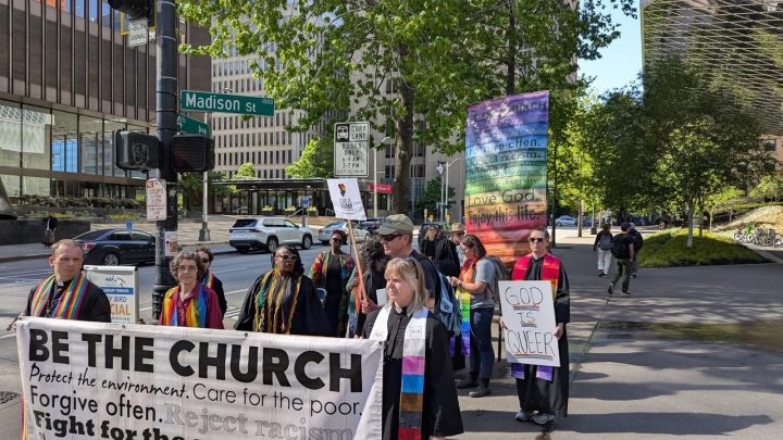 When we got to Cal Anderson Park, we met up with over 70 other clergy and laypeople who were all decked out with signs and rainbows. Here are about one third of them.